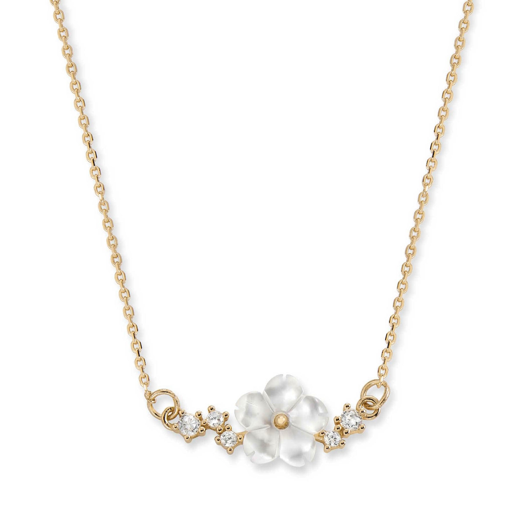 - Materials: Fine 14K Gold Plating on a Durable Copper Base, Protective Tarnish-Resistant Coating, Cubic Zirconia, Hand-Carved Genuine Mother-of-Pearl Flower